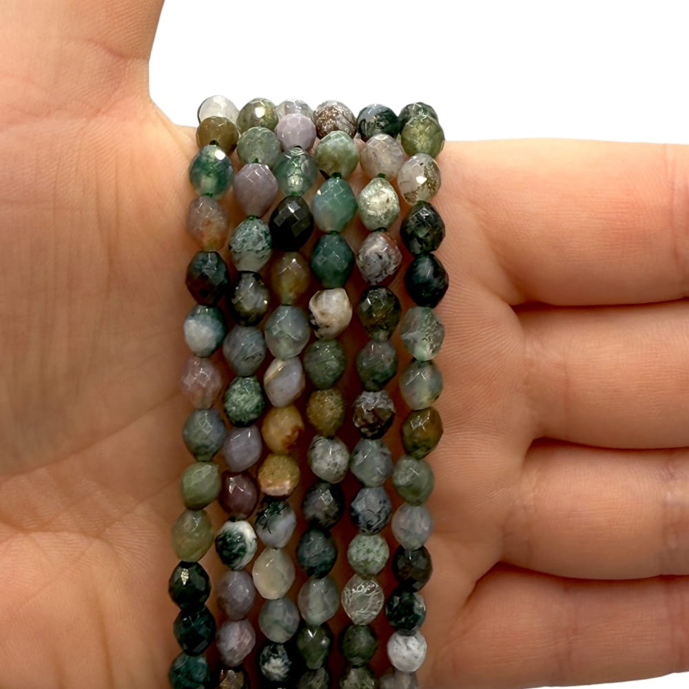 Fasetowane owale z agatu indyjskiego o wymiarach ok. 5×7 mm – naturalna paleta zieleni, brązów i kremowych tonów w eleganckiej formie.