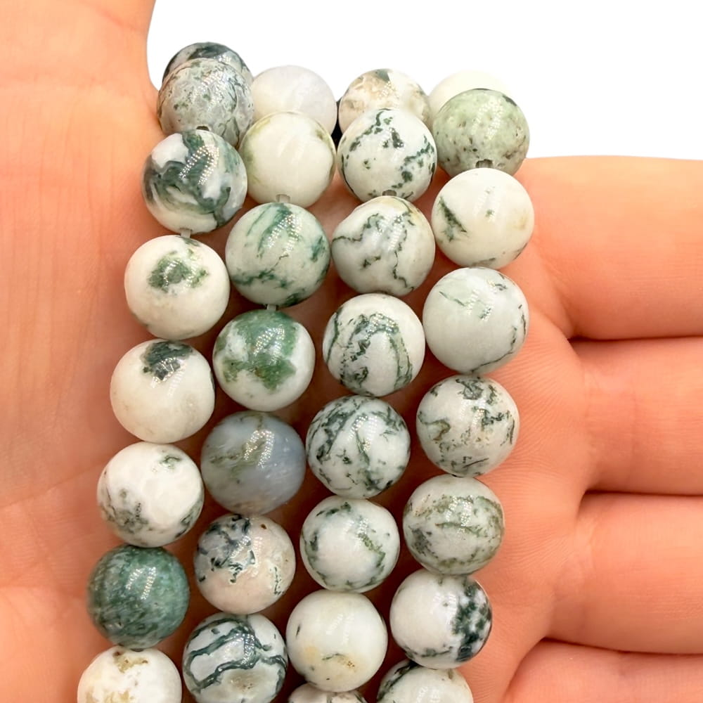 Agat mszysty to unikatowa odmiana chalcedonu, w której zielone inkluzje przypominają leśne mchy i paprocie. Gładkie kule o średnicy około 10 mm pięknie podkreślają strukturę inkluzji, nadając każdemu koralikowi głębi i naturalnego uroku. W formie gładkich kul o średnicy ok. 10 mm prezentuje się bardzo efektownie – większy rozmiar sprawia, że kamień staje się centralnym punktem kompozycji biżuteryjnych.
