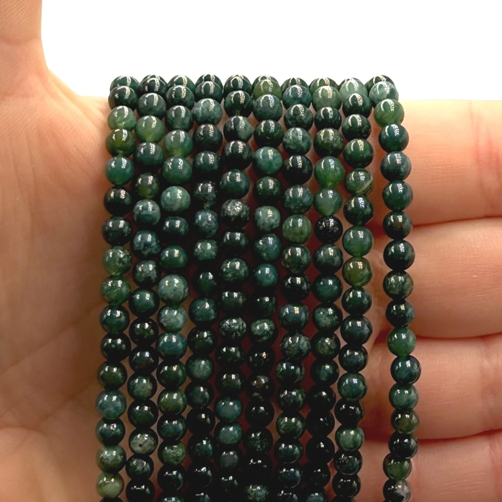 Gładkie kulki Agatu Mszystego o średnicy ok. 4 mm – naturalne, zielone odcienie z subtelnymi wzorami przypominającymi mech, idealne do eleganckiej, minimalistycznej i energetycznej biżuterii.