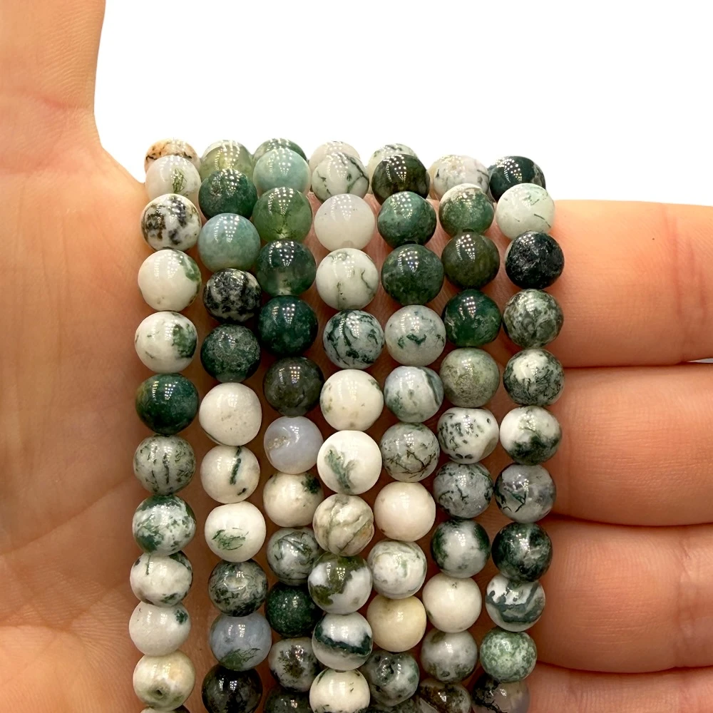 Gładkie kulki agatu mszystego biało-zielonego o średnicy ok. 6 mm – intensywnie zielone, harmonijne i elegancko połyskujące. Idealne do biżuterii naturalnej, świeżej i inspirowanej energią natury.