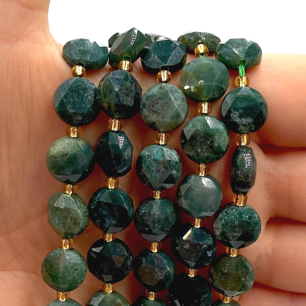 W formie fasetowanych pastylek o wymiarach ok. 10 mm agat mszysty prezentuje się elegancko i naturalnie, idealnie do bransoletek, naszyjników, kolczyków i projektów typu statement lub layering.