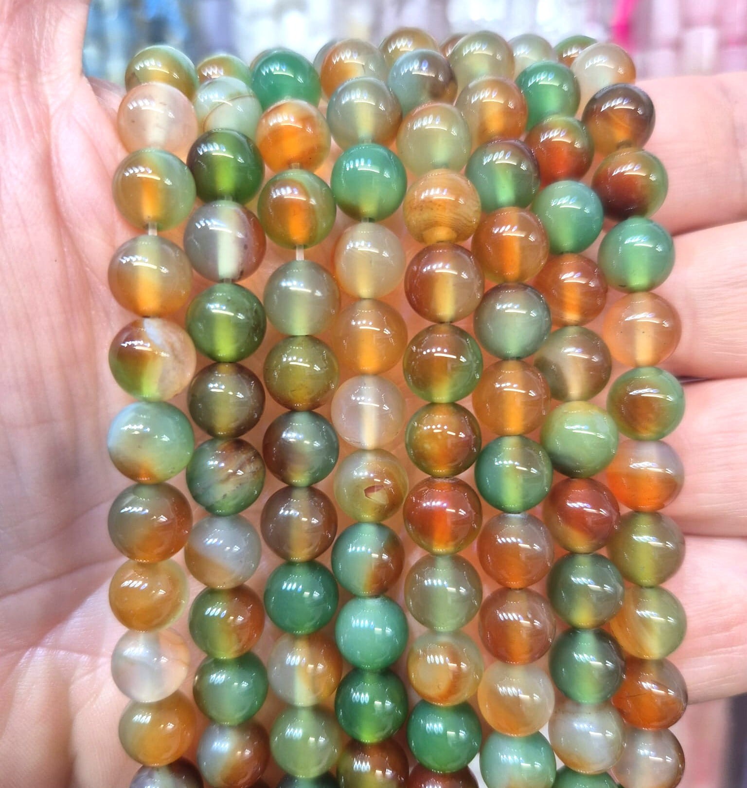 Gładkie kulki agatu pawiego o średnicy ok. 8 mm – kamień o wyjątkowym, wielobarwnym wzorze przypominającym pawie pióra. Głębokie odcienie zieleni, granatu, brązu i złota tworzą efektowną, naturalną mozaikę. Idealny do biżuterii wyrazistej, eleganckiej i projektów inspirowanych naturą.