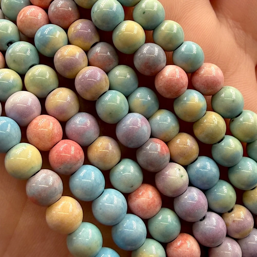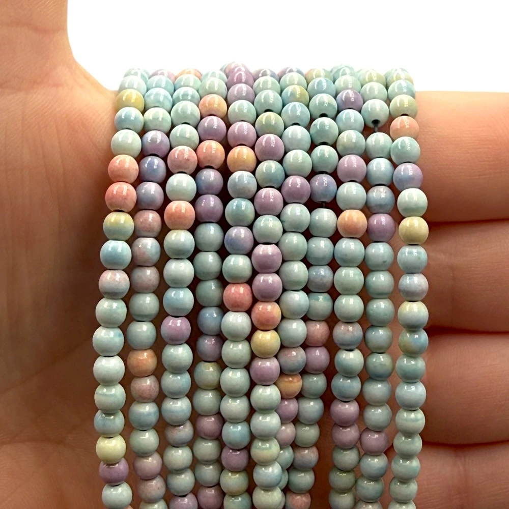 Gładkie kulki agatu tęczowego o średnicy ok. 6 mm — intensywne, wielobarwne odcienie tworzą efektowną, dynamiczną kompozycję kolorystyczną. Kamień syntetyczny. Idealne do biżuterii handmade, projektów boho oraz wyrazistych kompozycji.
