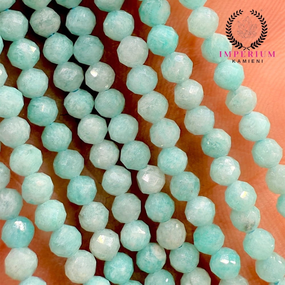 Fasetowane kulki amazonitu jasnego o średnicy ok. 3 mm – subtelna, pastelowa zieleń z naturalnym połyskiem, idealne do biżuterii minimalistycznej, delikatnej i projektów o lekkim, harmonijnym charakterze.