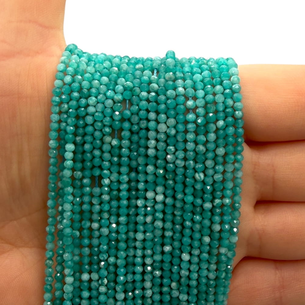 W formie fasetowanych kulek o średnicy ok. 2 mm amazonit prezentuje się lekko i nowocześnie, idealnie do bransoletek, naszyjników i kolczyków minimalistycznych lub layeringowych.