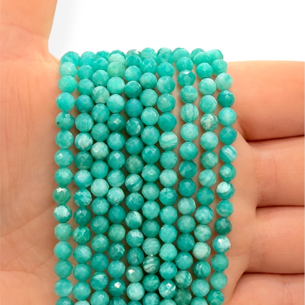 Fasetowane kulki amazonitu peruwiańskiego o średnicy ok. 4 mm – intensywne, świeże i pełne naturalnego blasku. Idealne do biżuterii pastelowej, harmonijnej i inspirowanej naturą.