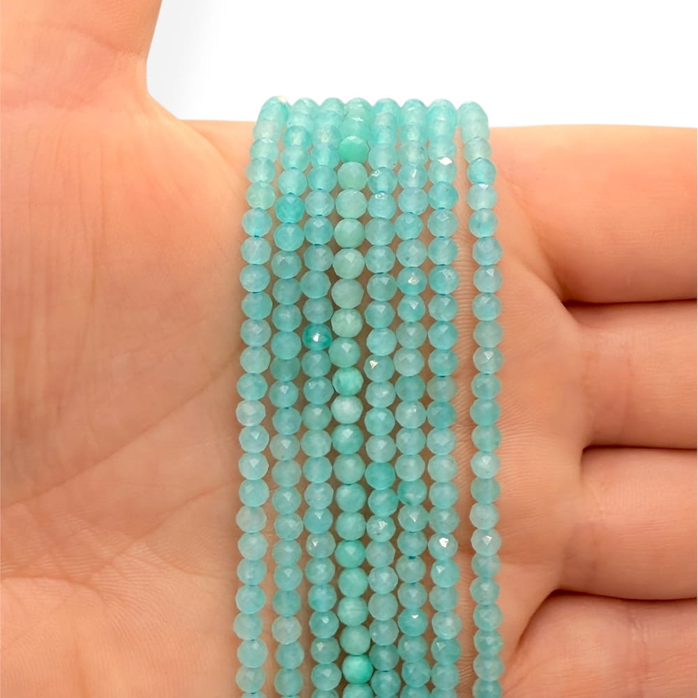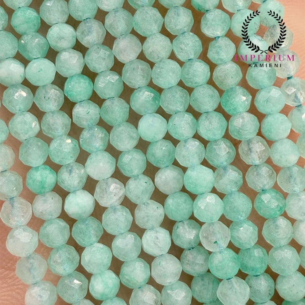 Amazonit Peruwiański Jasny – kulka fasetowana o średnicy ok. 3 mm – drobne kulki w delikatnym, miękkim odcieniu zieleni z wyraźnym szlifem fasetowym. Idealne do biżuterii subtelnej, minimalistycznej i projektów handmade o lekkim, eleganckim charakterze.