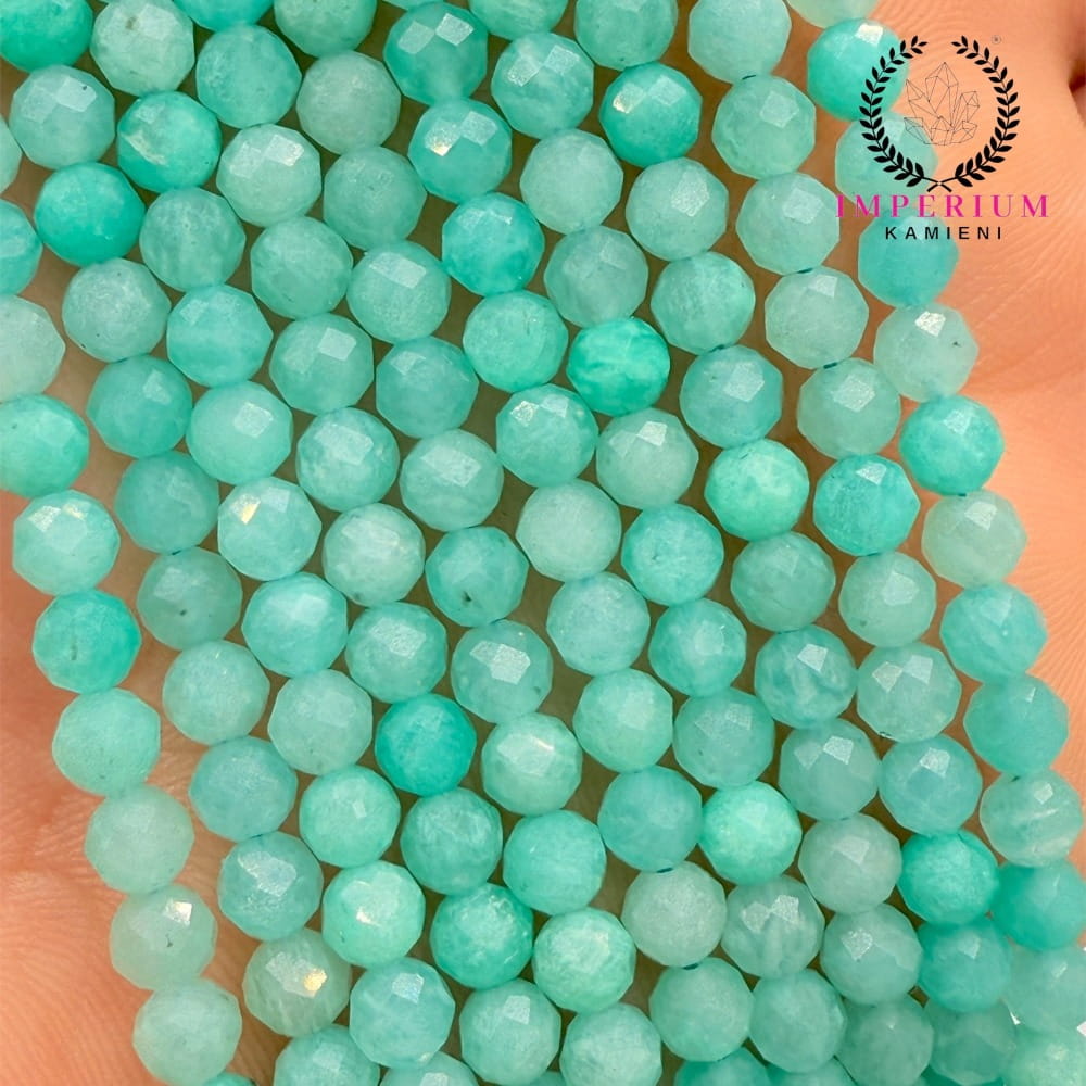 Fasetowane kulki amazonitu peruwiańskiego o średnicy ok. 4 mm – intensywne, świeże i pełne naturalnego blasku. Idealne do biżuterii pastelowej, harmonijnej i inspirowanej naturą.