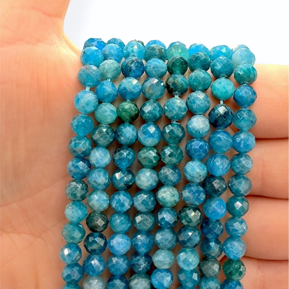 Apatyt to kamień o niebieskiej barwie, której intensywność rośnie wraz ze wzrostem rozmiaru szlifu. Fasetowane kule o średnicy około 6 mm pięknie wydobywają naturalny połysk i głębię barwy, wprowadzając do projektów wyrafinowany, lecz subtelny akcent. Ich uniwersalny rozmiar sprawdzi się zarówno w samodzielnych naszyjnikach i bransoletkach, jak i w zestawieniach z drobną biżuterią.