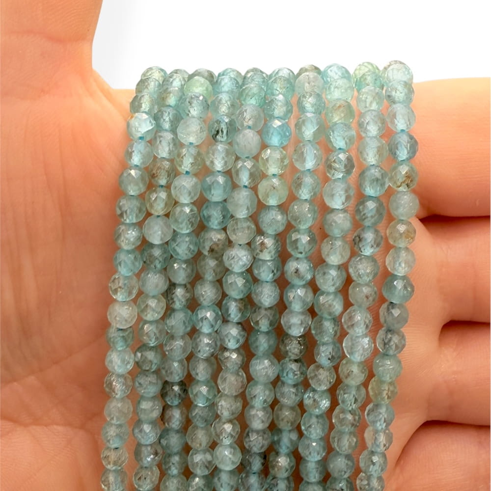 Fasetowane kulki apatytu morskiego o średnicy ok. 4 mm – intensywny turkusowo-niebieski odcień z naturalnym połyskiem. Idealne do minimalistycznej i eleganckiej biżuterii oraz projektów z energetycznym, morskim akcentem.