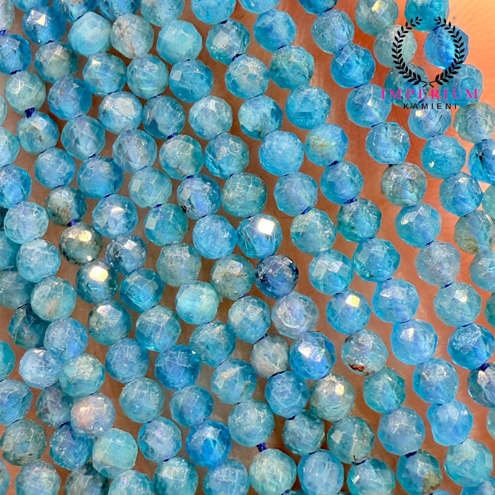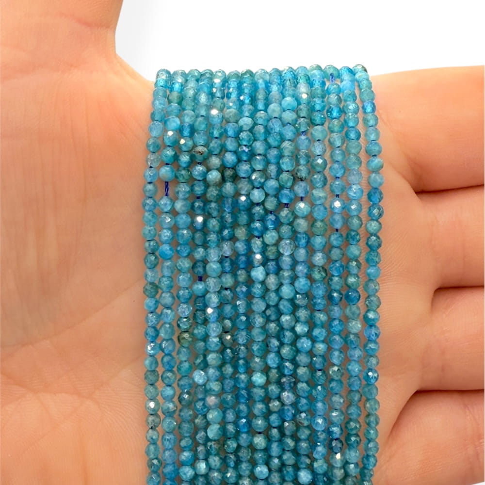 Subtelne kulki z niebieskiego apatytu fasetowanego o średnicy ok. 2 mm – idealne do finezyjnej, chłodnej biżuterii.