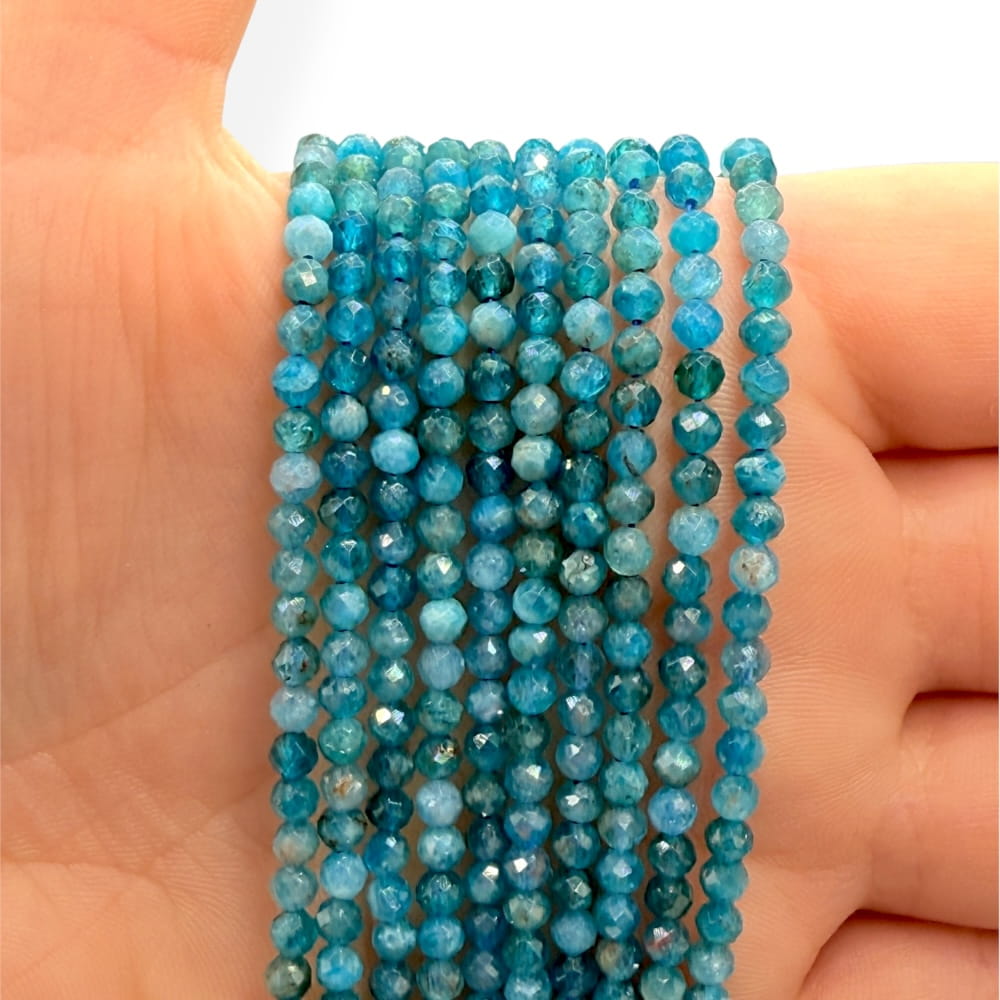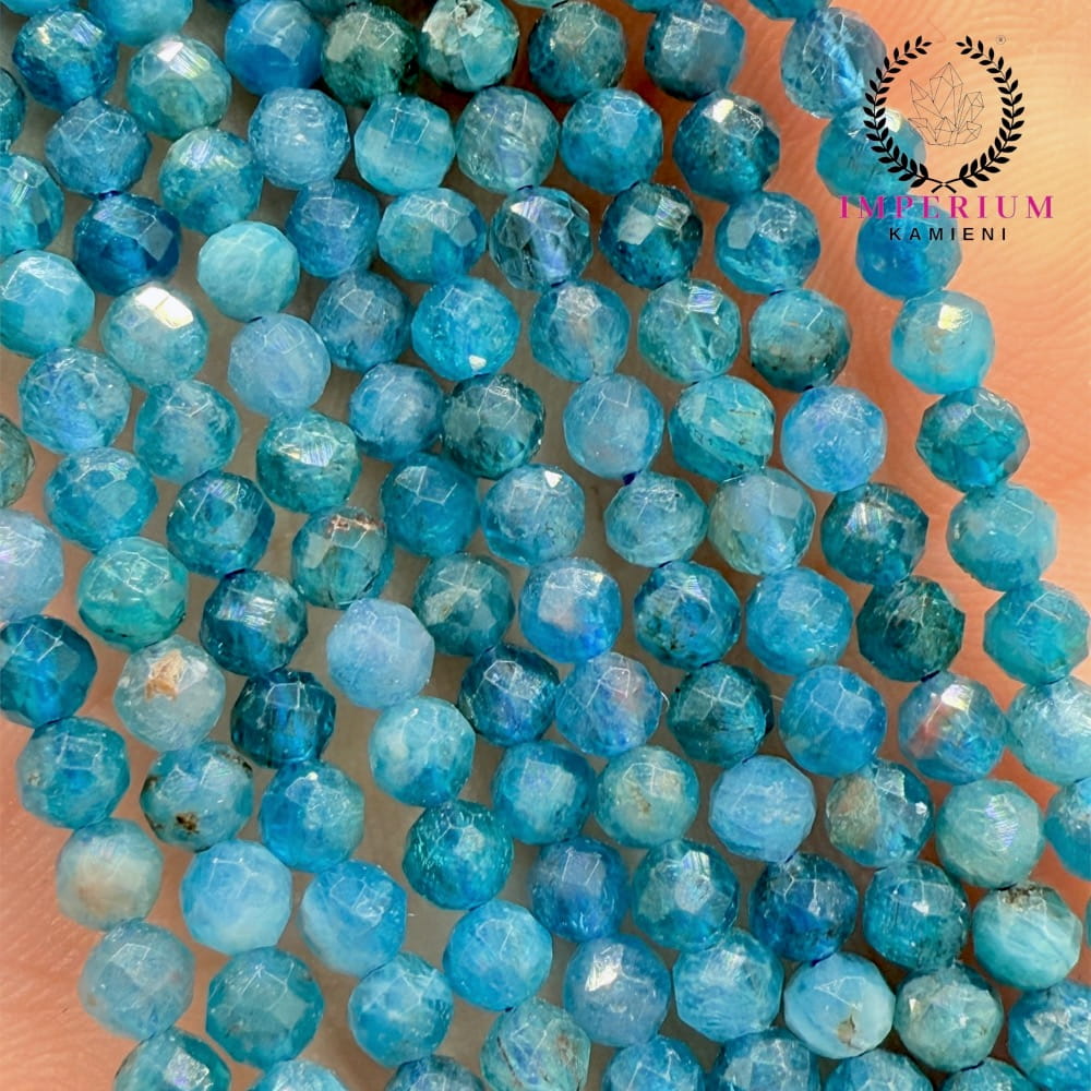 Fasetowane kulki Apatytu Niebieskiego o średnicy ok. 3 mm – intensywny, niebieski kamień z delikatnym połyskiem. Idealne do biżuterii minimalistycznej, eleganckiej i projektów o energetycznym, wyrazistym charakterze.