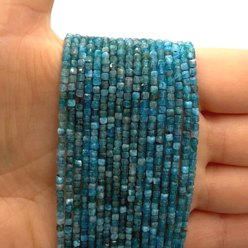 Fasetowane kostki apatytu o wymiarach ok. 2x2 mm – intensywny niebieski odcień z naturalnym połyskiem. Idealne do minimalistycznej i eleganckiej biżuterii oraz projektów z energetycznym akcentem koloru.