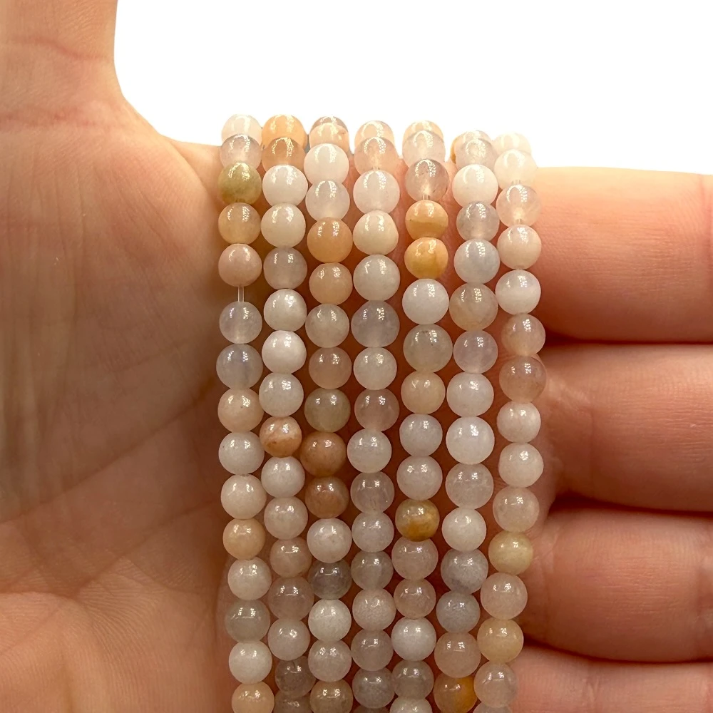 Gładkie kulki awenturynu brzoskwiniowego o średnicy ok. 4 mm – ciepła, delikatna pomarańczowo-biała barwa z subtelnym połyskiem. Idealne do biżuterii eleganckiej, minimalistycznej i projektów o łagodnym, energetycznym charakterze.