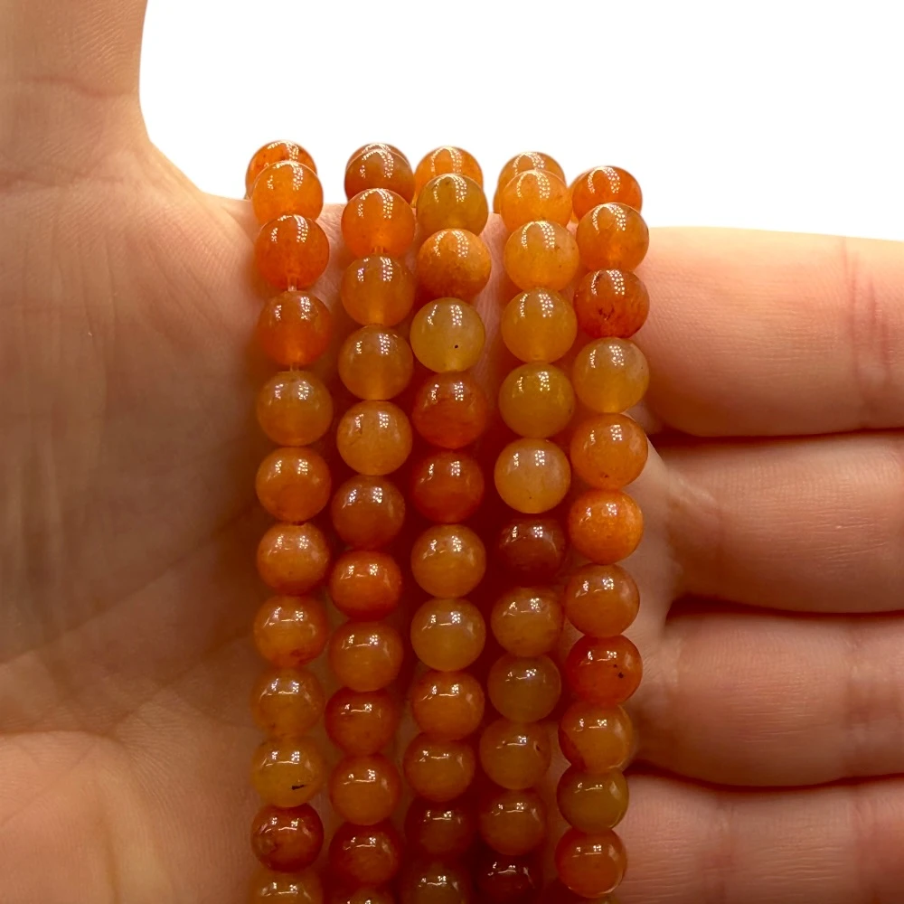 Gładkie kulki czerwonego awenturynu o średnicy ok. 6 mm – ciepłe, żywe i subtelnie połyskujące. Idealne do biżuterii energetycznej, eleganckiej i pełnej naturalnej harmonii.