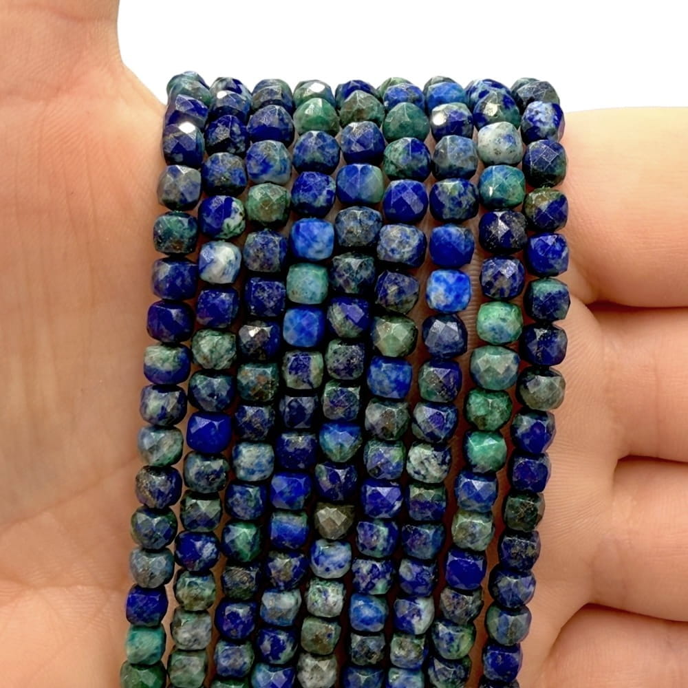 Fasetowane kostki z azurytu o wymiarach ok. 4x4 mm – kamień o intensywnej, głębokiej niebiesko-granatowej barwie z naturalnymi, ciemnymi przejściami. Idealny do biżuterii o artystycznym, energetycznym i wyrazistym charakterze.