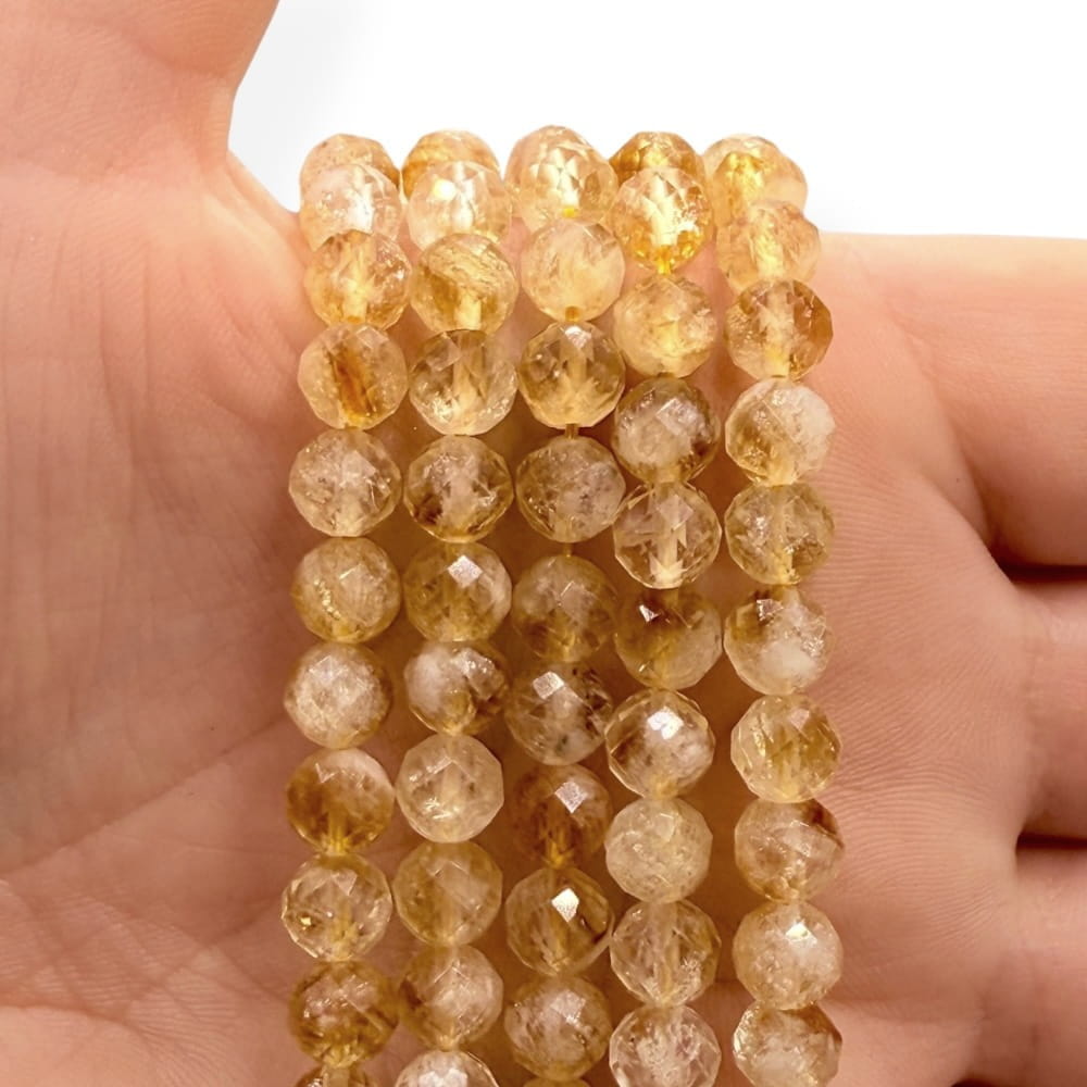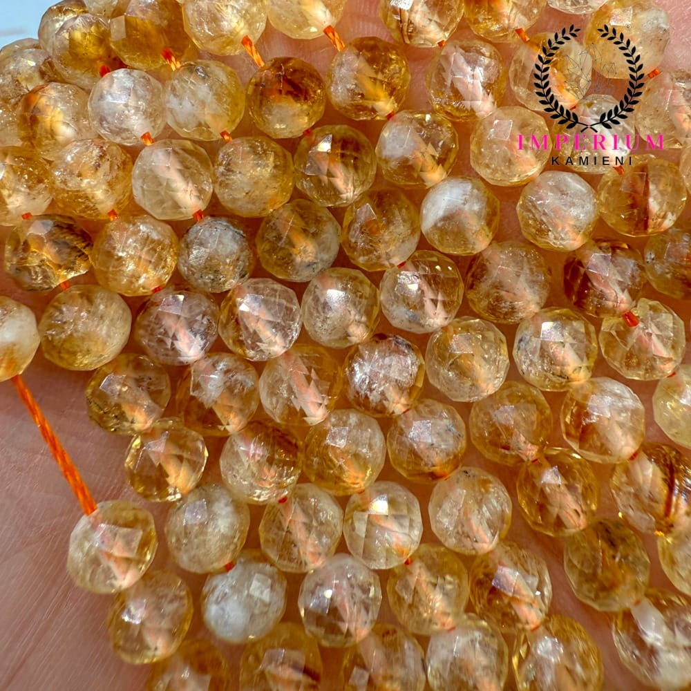 Fasetowane kulki cytrynu o średnicy ok. 6 mm – pełne słonecznej, ciepłej żółci i naturalnej przejrzystości. Idealne do biżuterii energetycznej, pozytywnej i rozświetlającej.
