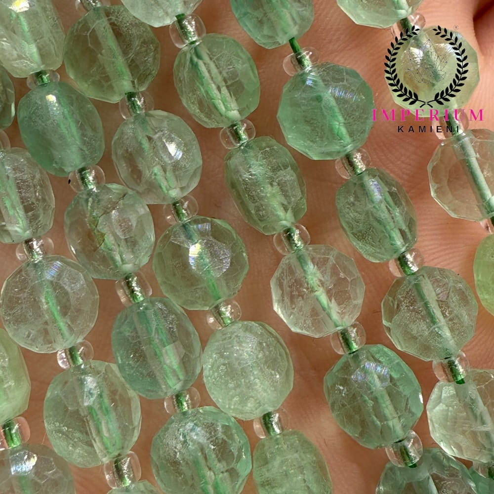 W formie fasetowanych pastylek o wymiarach ok. 8x5 mm fluoryt prezentuje się lekko i nowocześnie, idealnie nadając się do bransoletek, naszyjników oraz projektów typu layering.