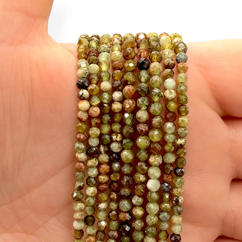 Drobne fasetowane kulki zielonego granatu o średnicy ok. 3 mm – intensywne, świetliste i eleganckie. Idealne do biżuterii, która łączy subtelność z wyrazistą, naturalną barwą.