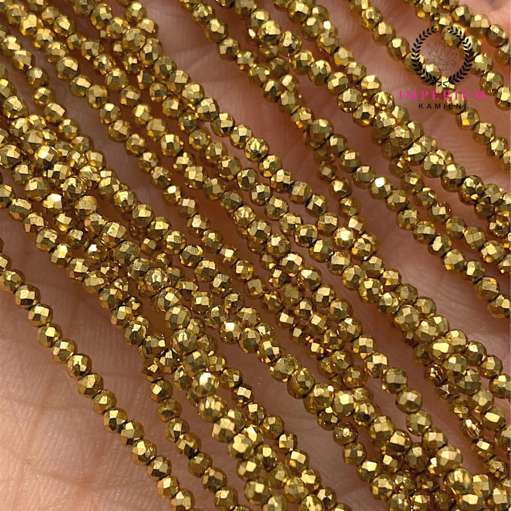Fasetowane kulki Hematytu w kolorze ciepłego złota o średnicy ok. 2 mm – drobne, błyszczące i eleganckie, idealne do minimalistycznej i nowoczesnej biżuterii.