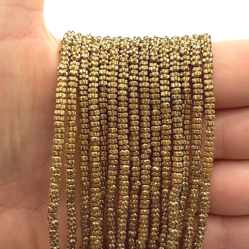 Hematyt w kolorze ciepłego złota to wyjątkowo elegancki i trwały materiał, który dzięki swojemu metalicznemu połyskowi pięknie prezentuje się w każdej formie. W odsłonie drobnych kwiatków o wymiarach ok. 3x1 mm elementy te nabierają szczególnego uroku – są delikatne, kobiece i doskonale nadają biżuterii subtelnie dekoracyjnego charakteru.
