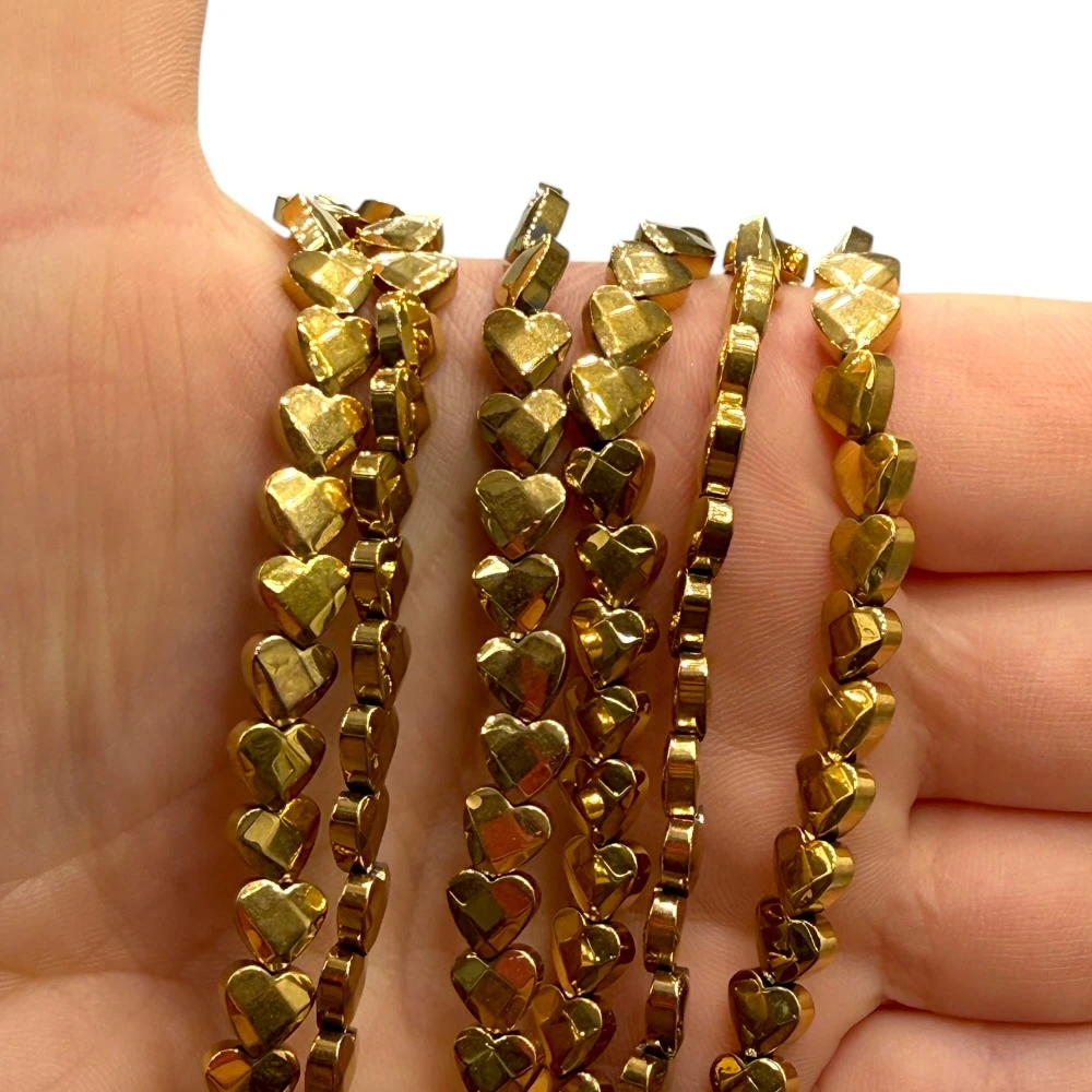 Fasetowane serce hematytu w kolorze ciepłego złota o wymiarze ok. 6 mm – eleganckie, subtelnie błyszczące, idealne do biżuterii romantycznej, minimalistycznej i nowoczesnej.