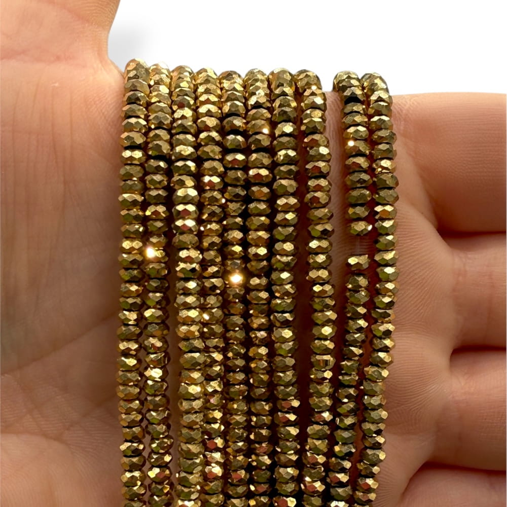 Fasetowane oponki hematytu o średnicy ok. 4x2 mm w kolorze ciepłego złota – subtelnie połyskujące, eleganckie i wyraziste. Idealne do biżuterii minimalistycznej, energetycznej i projektów o luksusowym charakterze.