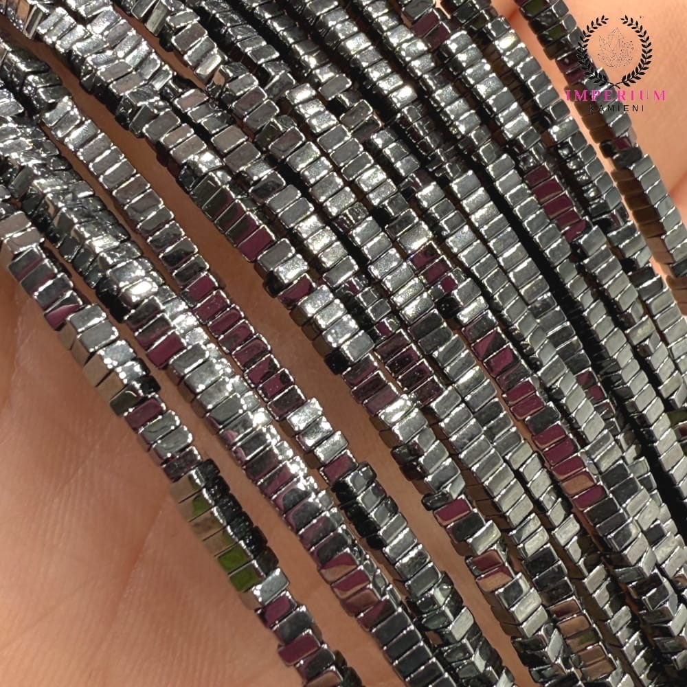 Czarne kwadratowe płytki hematytu o wymiarach ok. 2x1 mm – minimalistyczna forma, głęboka czerń i delikatny metaliczny połysk. Idealne do nowoczesnej, geometrycznej biżuterii oraz projektów wymagających subtelnego, ale wyrazistego akcentu.