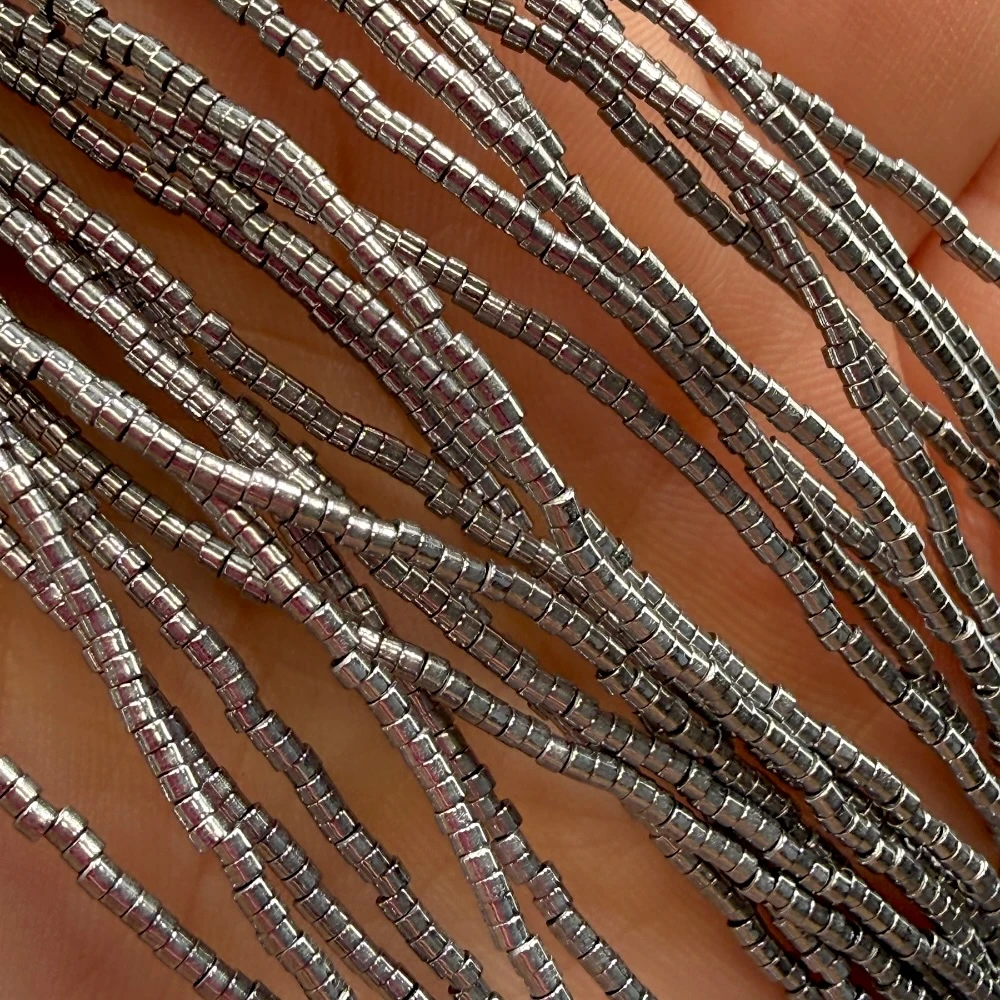 Hematyt w formie drobnych krążków heishi o wymiarach ok. 1x1 mm w kolorze srebrnym. Trwały, elegancki i niezwykle uniwersalny – idealny do tworzenia biżuterii o delikatnym, szlachetnym charakterze.