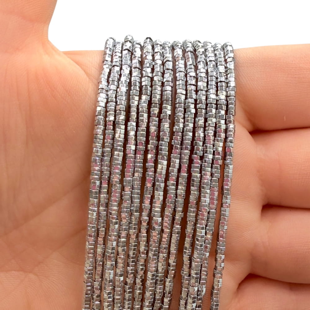 Hematyt – nakrętka, kolor srebrny o wymiarach ok. 2x1 mm – malutkie, metalicznie połyskujące elementy w kształcie nakrętki. Idealne do biżuterii minimalistycznej, delikatnej i projektów handmade z subtelnymi, srebrnymi akcentami.