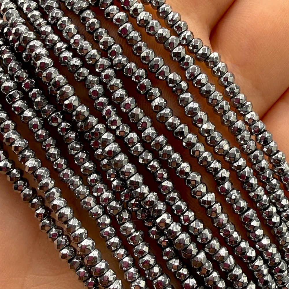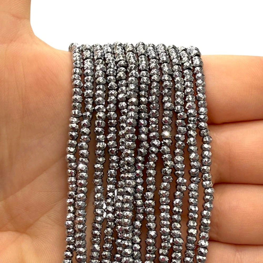 Drobne fasetowane oponki z hematytu o wymiarach ok. 3x2 mm w kolorze srebrnym – eleganckie, błyszczące i bardzo trwałe. Idealne jako subtelne przekładki w delikatnej i nowoczesnej biżuterii.