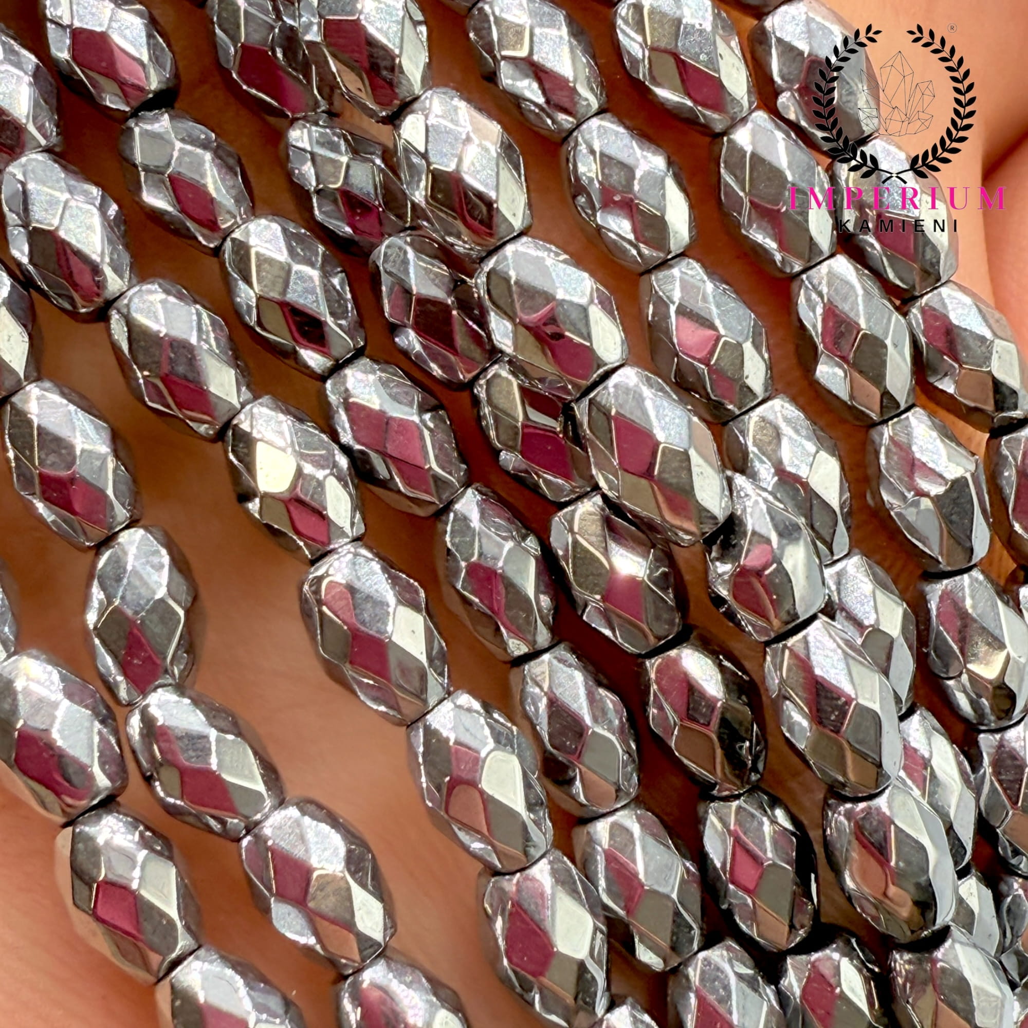 Fasetowane elementy z hematytu w kształcie ryżu o wymiarach ok. 3x5 mm w kolorze srebrnym – eleganckie, trwałe i pełne subtelnego, metalicznego blasku. Idealne jako dekoracyjny akcent w bransoletkach, naszyjnikach i kolczykach.