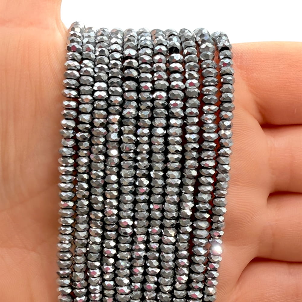 Fasetowane oponki z hematytu o wymiarach ok. 4x1,5 mm w kolorze srebrnym – eleganckie, błyszczące i wyjątkowo trwałe. Idealne jako dekoracyjne przekładki lub główny akcent w nowoczesnej biżuterii.
