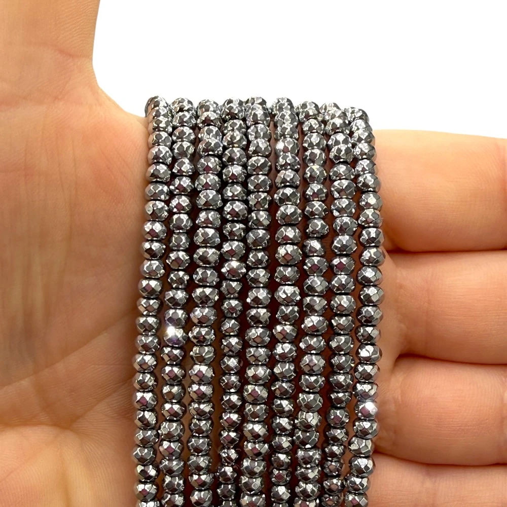 Fasetowane oponki z hematytu o wymiarach ok. 4x3 mm w kolorze srebrnym – eleganckie, błyszczące i wyjątkowo trwałe. Idealne jako dekoracyjne przekładki lub główny akcent w nowoczesnej biżuterii.