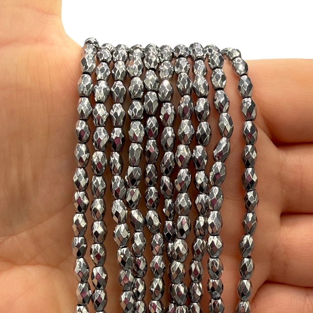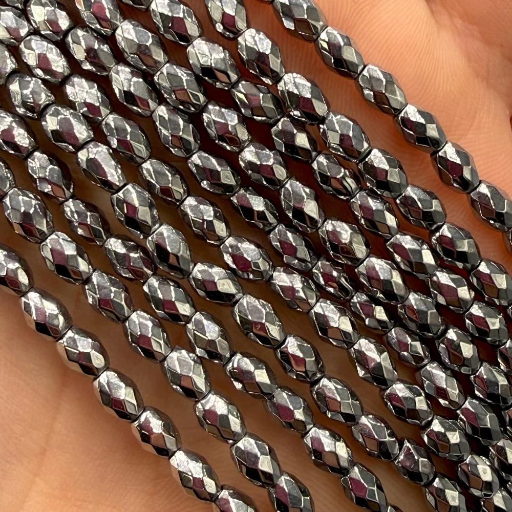 Fasetowane elementy z hematytu w kształcie ryżu o wymiarach ok. 4x6 mm w kolorze srebrnym – eleganckie, wyraziste i niezwykle trwałe. Idealne jako główny akcent lub dekoracyjna przekładka w biżuterii.