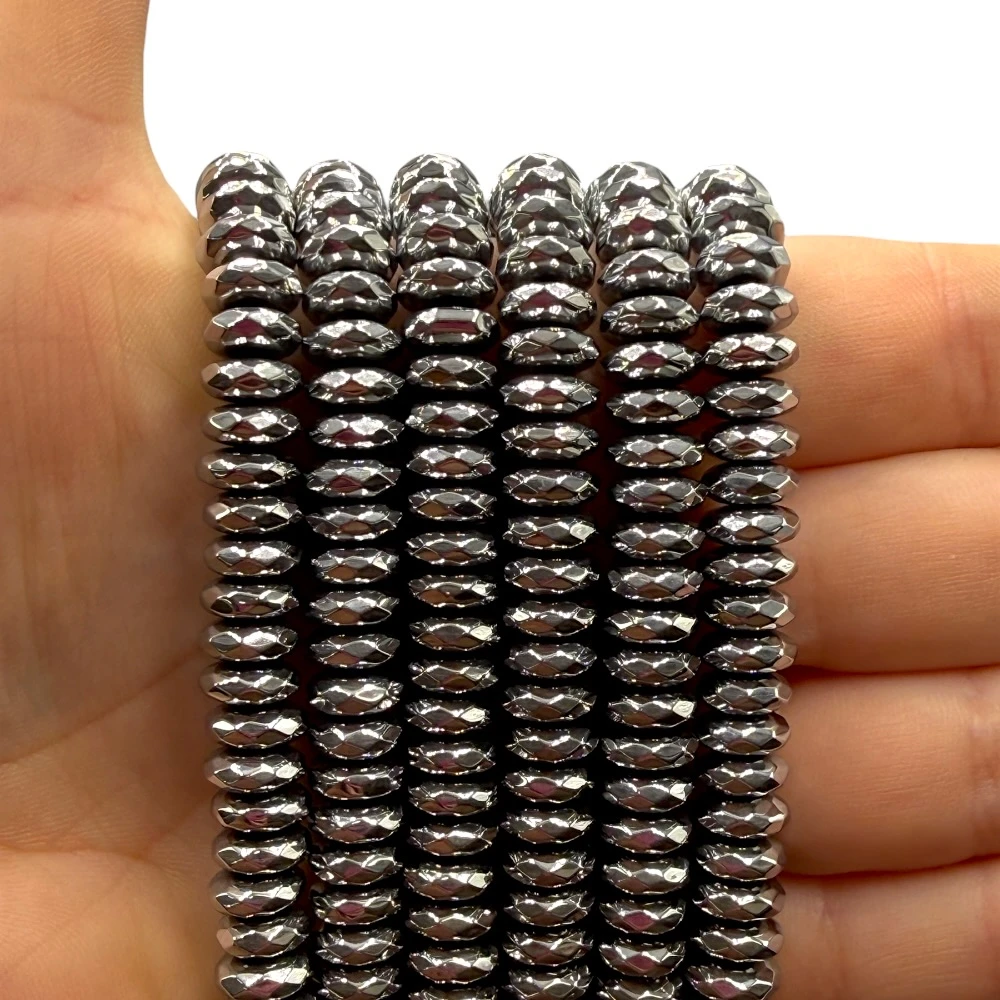 Fasetowane oponki z hematytu o wymiarach ok. 8x3 mm w kolorze srebrnym – eleganckie, błyszczące i wyjątkowo trwałe. Idealne jako dekoracyjne przekładki lub główny akcent w nowoczesnej biżuterii.