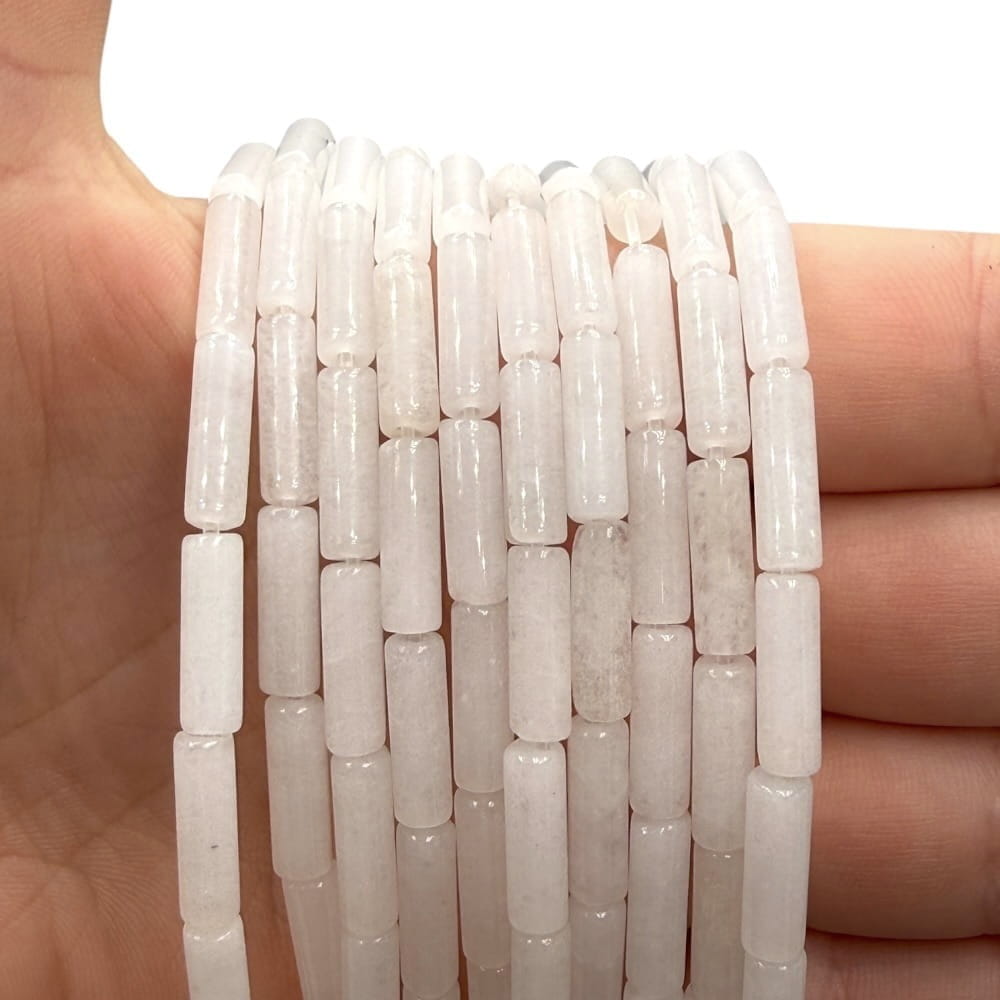 Walce białego jadeitu o wymiarach ok. 4x13 mm – czysta, mleczna biel z delikatnym, naturalnym połyskiem. Idealne do eleganckiej, minimalistycznej biżuterii oraz projektów o spokojnym, harmonijnym charakterze.