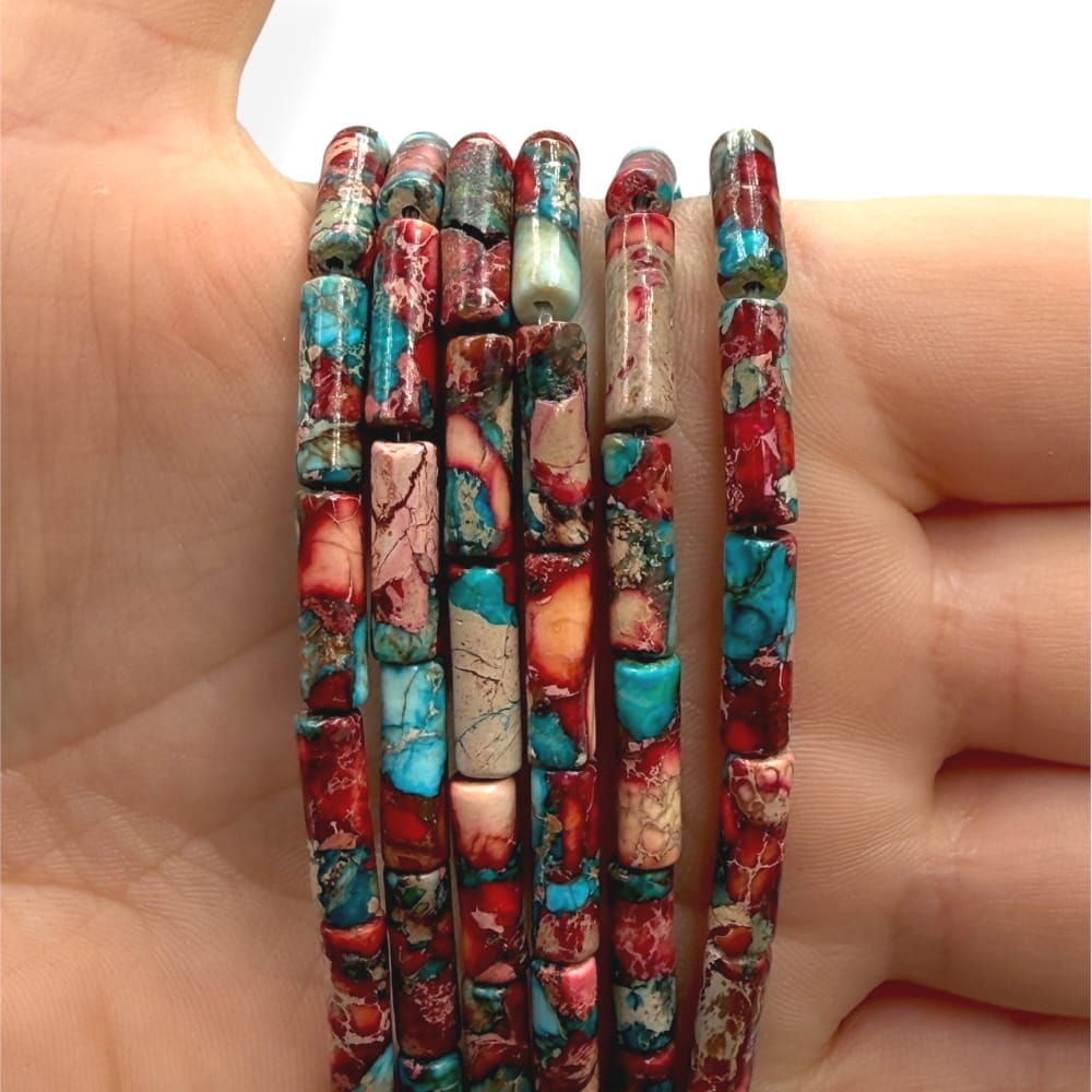 Intensywne walce gładkie z jaspisu cesarskiego „czerwony” o wymiarach ok. 4×13 mm – idealne do królewskiej, energetycznej biżuterii.