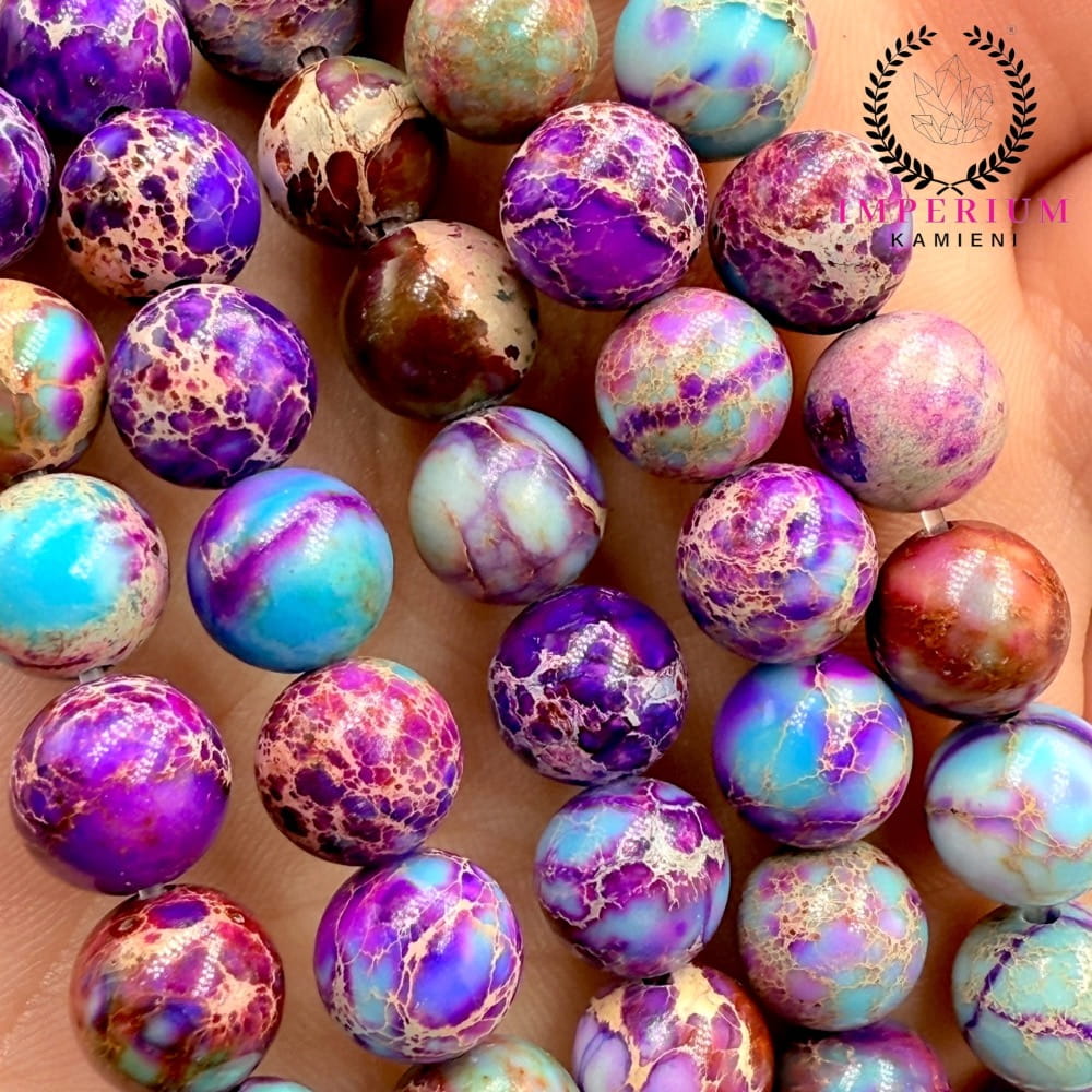 Jaspis cesarski fioletowy to kamień o intensywnej fioletowej barwie, symbolizujący równowagę, intuicję i ochronę energetyczną. Gładka powierzchnia kulek podkreśla naturalną głębię koloru i subtelne refleksy, nadając biżuterii elegancji i wyrafinowanego charakteru. Każda kulka jest wyjątkowa dzięki naturalnym różnicom w odcieniu i połysku.