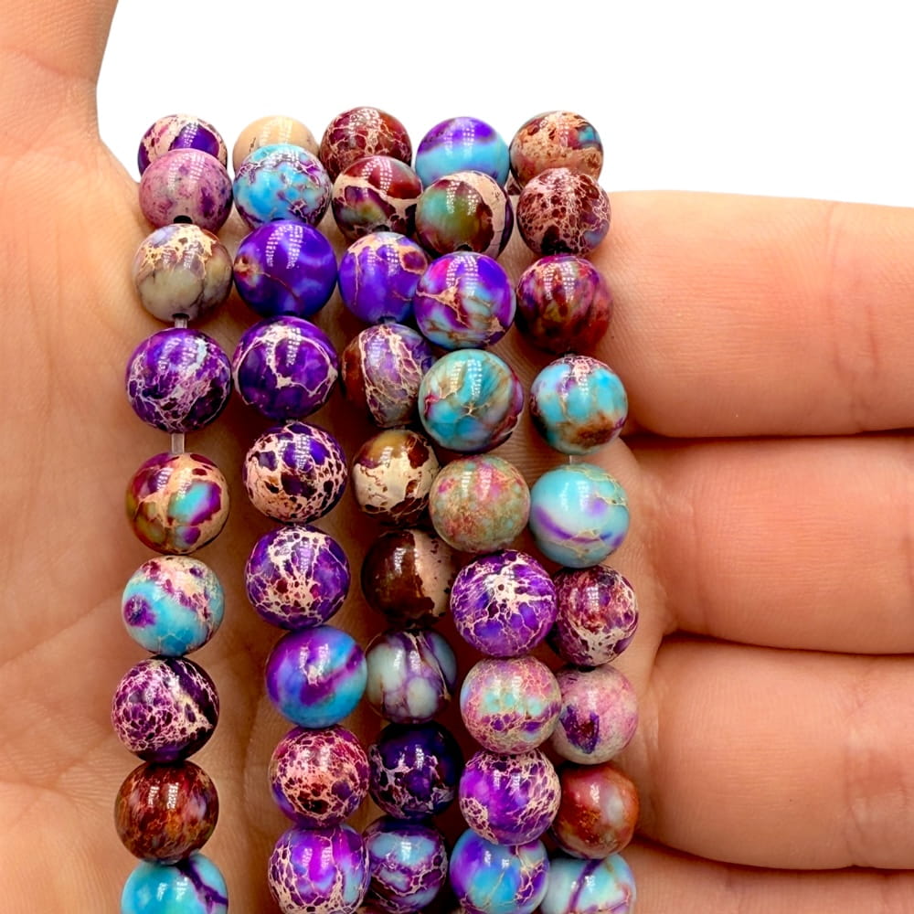 Gładkie kulki jaspisu cesarskiego fioletowego o średnicy ok. 8 mm – głęboka, królewska fioletowa barwa z naturalnymi refleksami. Idealne do biżuterii eleganckiej, mistycznej i projektów o wyrazistym, energetycznym charakterze.