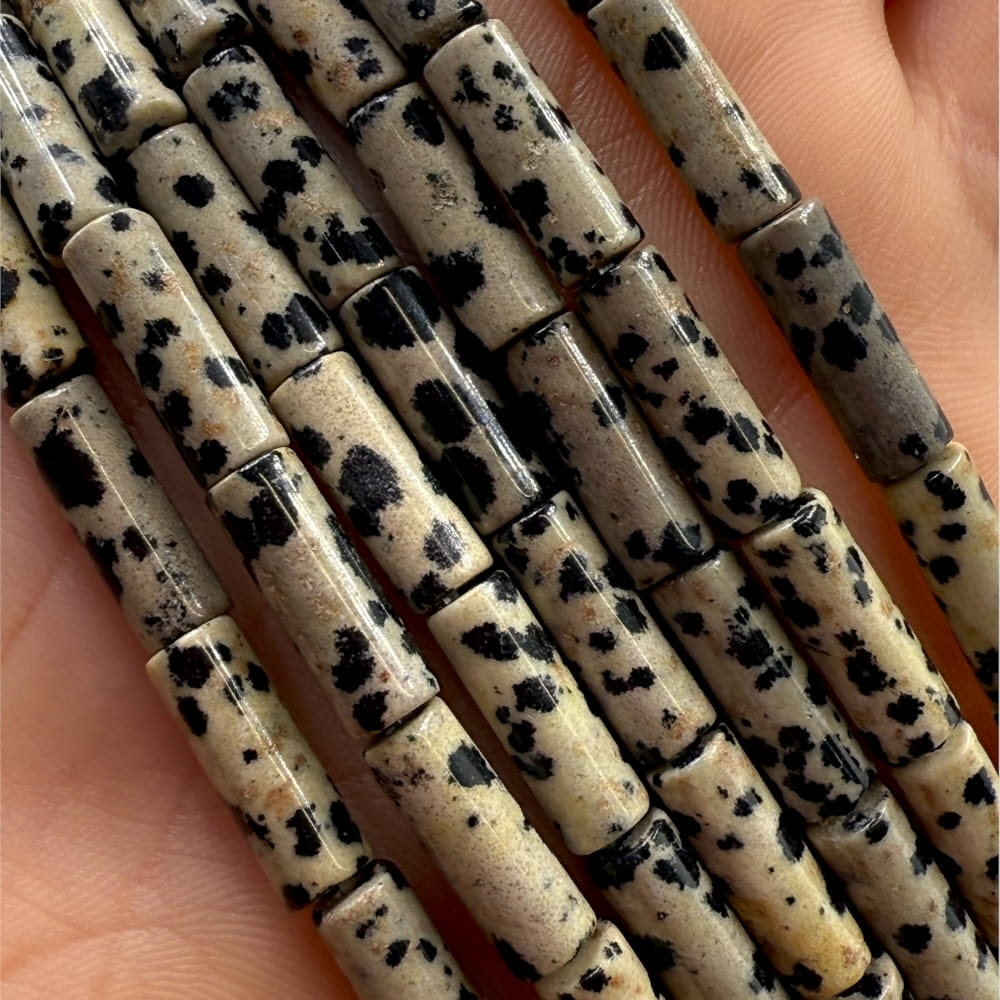 Walce Jaspisu Dalmatyńskiego o wymiarach ok. 4x13 mm – kremowo-biała baza z charakterystycznymi czarnymi plamkami nadaje biżuterii wyrazisty, nowoczesny i unikalny charakter. Idealne do minimalistycznych projektów oraz efektownych akcentów.