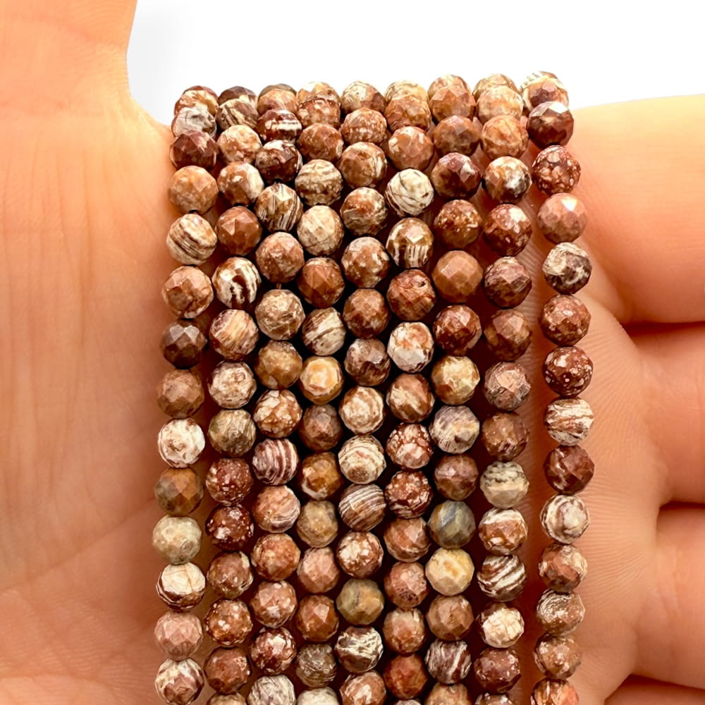 Fasetowane kulki jaspisu leopard o średnicy ok. 4 mm – kremowo-brązowe tło z charakterystycznymi ciemnymi plamkami, nadające biżuterii naturalnego, wyrazistego charakteru. Idealne do minimalistycznej i eleganckiej biżuterii oraz projektów z energetycznym akcentem natury.
