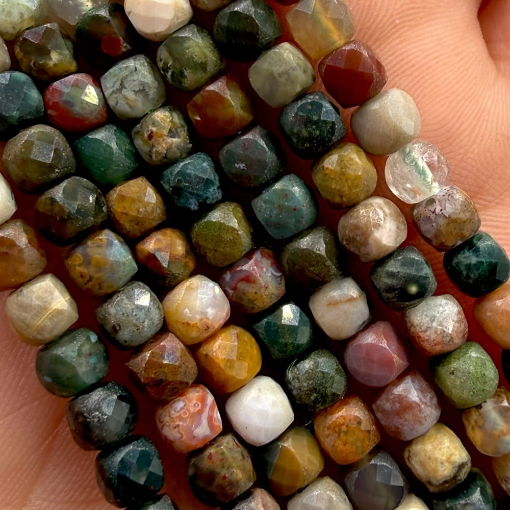 Fasetowane kostki z jaspisu oceanicznego o wymiarach ok. 4x4 mm – kamień o niezwykle zróżnicowanej palecie barw inspirowanej naturą: od turkusów i zieleni po beże, brązy i róże. Idealny do biżuterii pełnej harmonii, ciepła i organicznego charakteru.