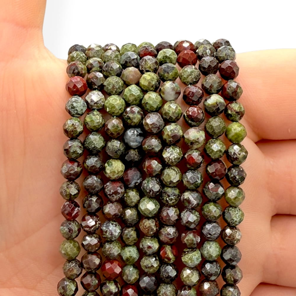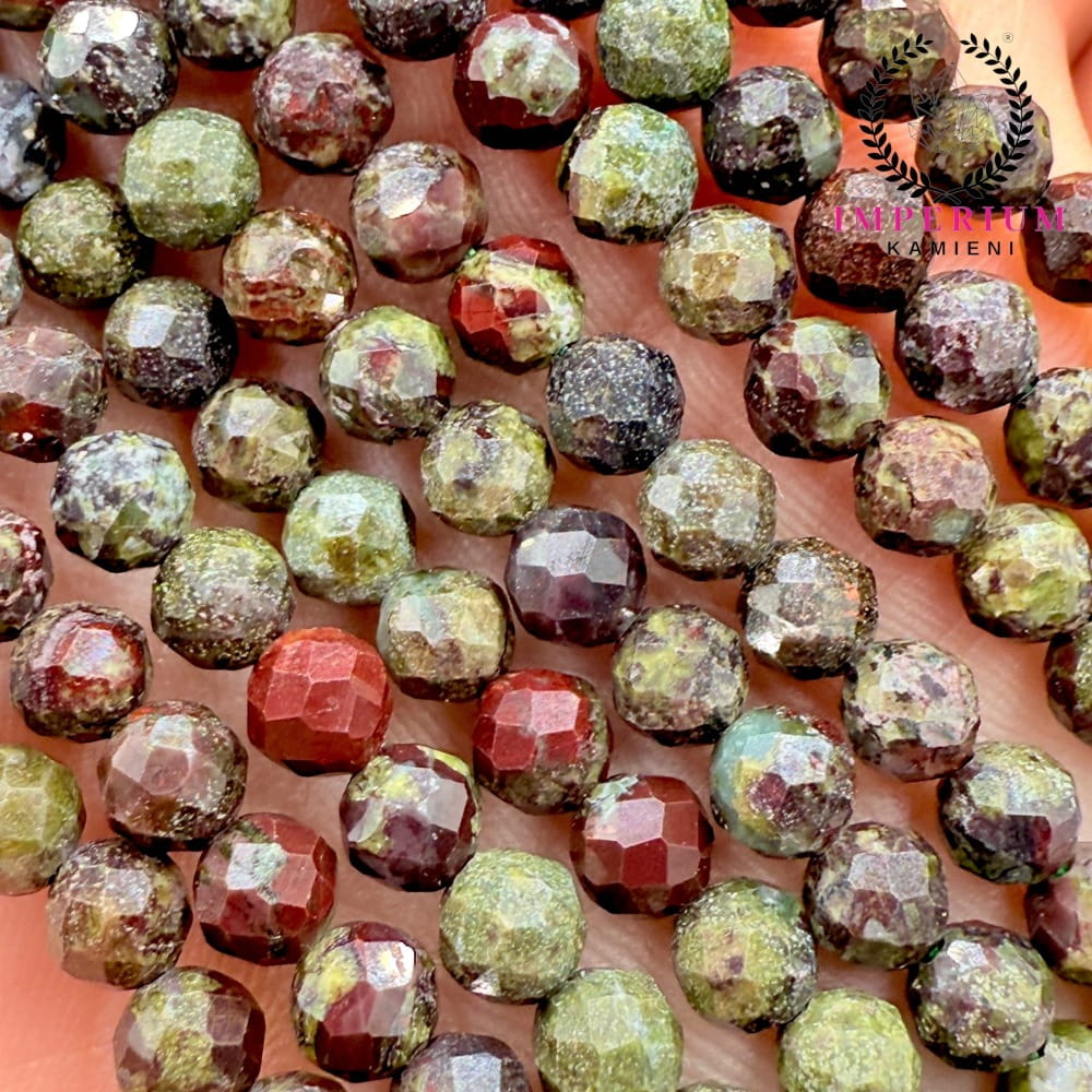 Fasetowane kulki jaspisu Smocza Krew o średnicy ok. 4 mm – głęboka, intensywna czerwień z naturalnymi ciemnymi inkluzjami, subtelnie połyskujące. Idealne do biżuterii energetycznej, ochronnej i projektów o wyrazistym, dynamicznym charakterze.