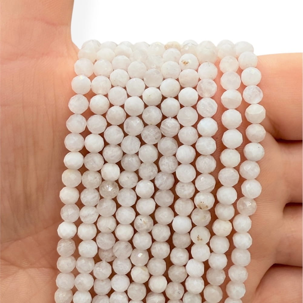 Fasetowane kulki kamienia księżycowego o średnicy ok. 4 mm – eteryczne, subtelnie opalizujące i pełne delikatnego blasku. Idealne do biżuterii romantycznej, eleganckiej i o magicznym charakterze.