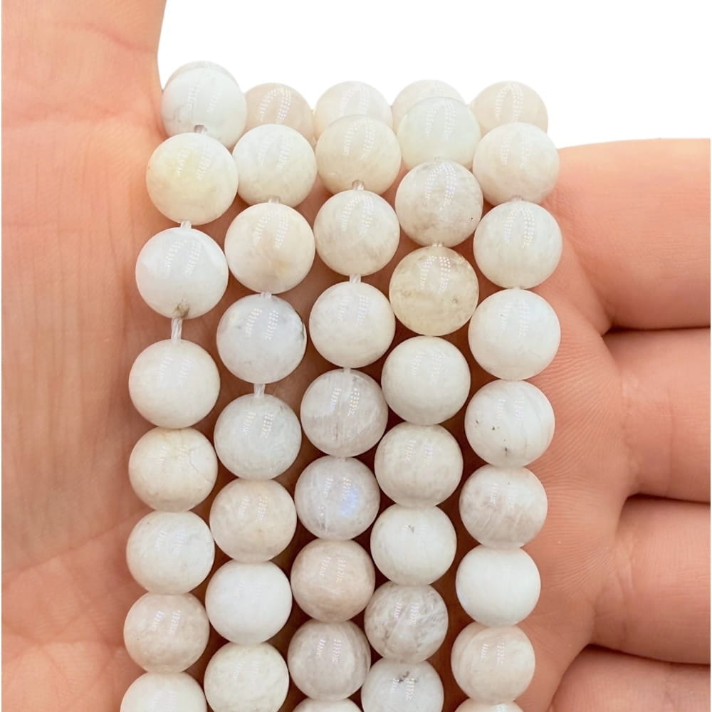 Gładkie kulki Kamienia Księżycowego o średnicy ok. 8 mm – delikatna, mleczna poświata z subtelnym opalizującym blaskiem. Idealne do eleganckiej, minimalistycznej i lekko mistycznej biżuterii.