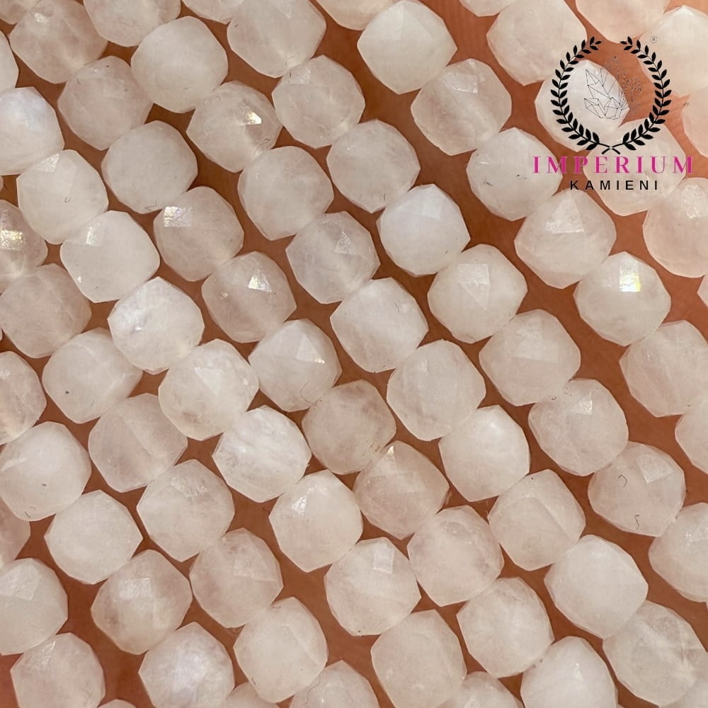 Jasny kamień księżycowy zachwyca swoją delikatną, mlecznobiałą barwą i charakterystycznym efektem adularescencji – migotliwego, niebieskawego lub srebrzystego połysku przesuwającego się po powierzchni kamienia. Fasetowane kostki o wymiarach ok. 4×4 mm zostały starannie oszlifowane, aby podkreślić tę grę światła i wydobyć naturalny urok minerału. Doskonale sprawdzi się w biżuterii o romantycznym, subtelnym i kobiecym charakterze.