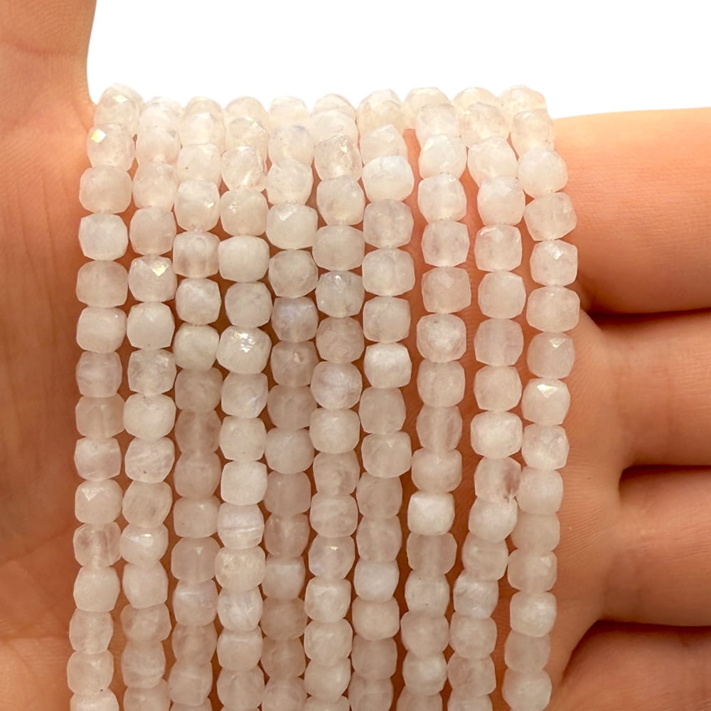 Fasetowane kostki z jasnego kamienia księżycowego o wymiarach ok. 4×4 mm – subtelny blask i delikatna opalescencja w eleganckiej formie.