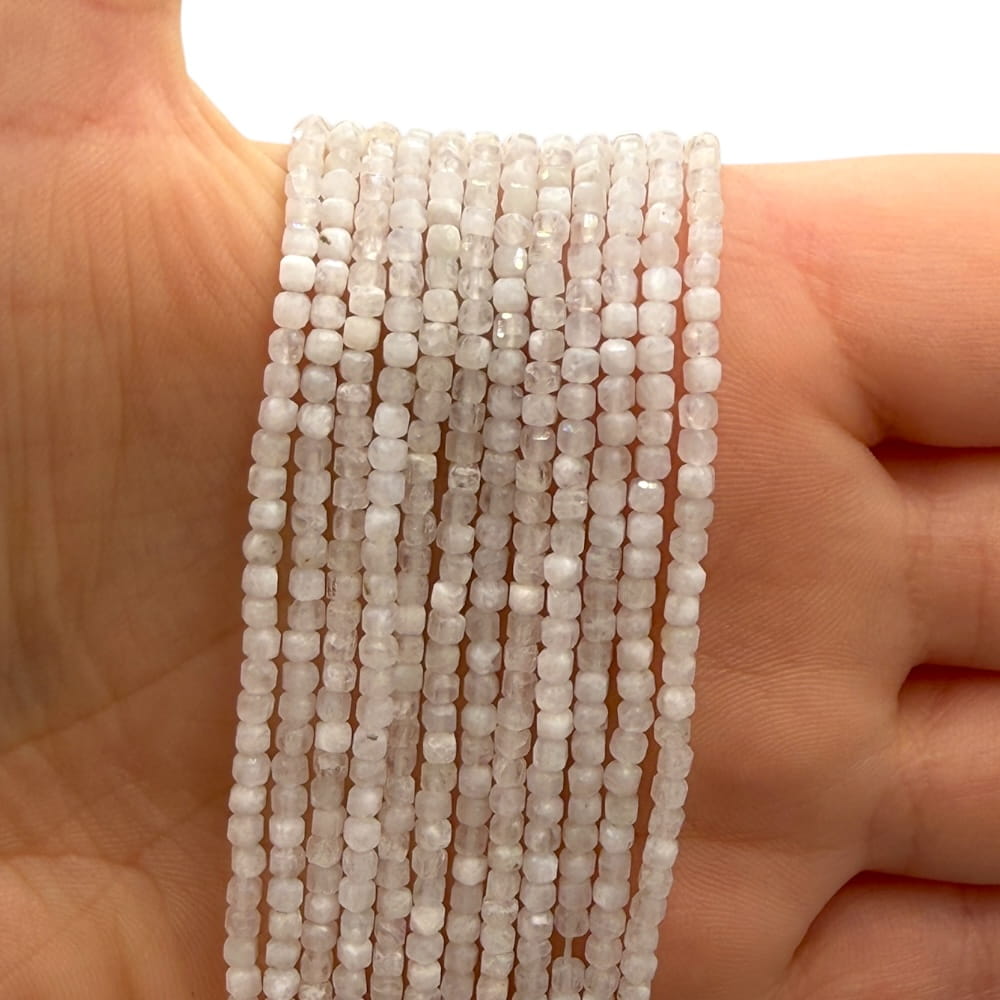 Kamień Księżycowy – kostka fasetowana o wymiarach ok. 2x2 mm – delikatny, mleczny kamień z subtelną opalizacją, idealny do drobnej, eleganckiej biżuterii.