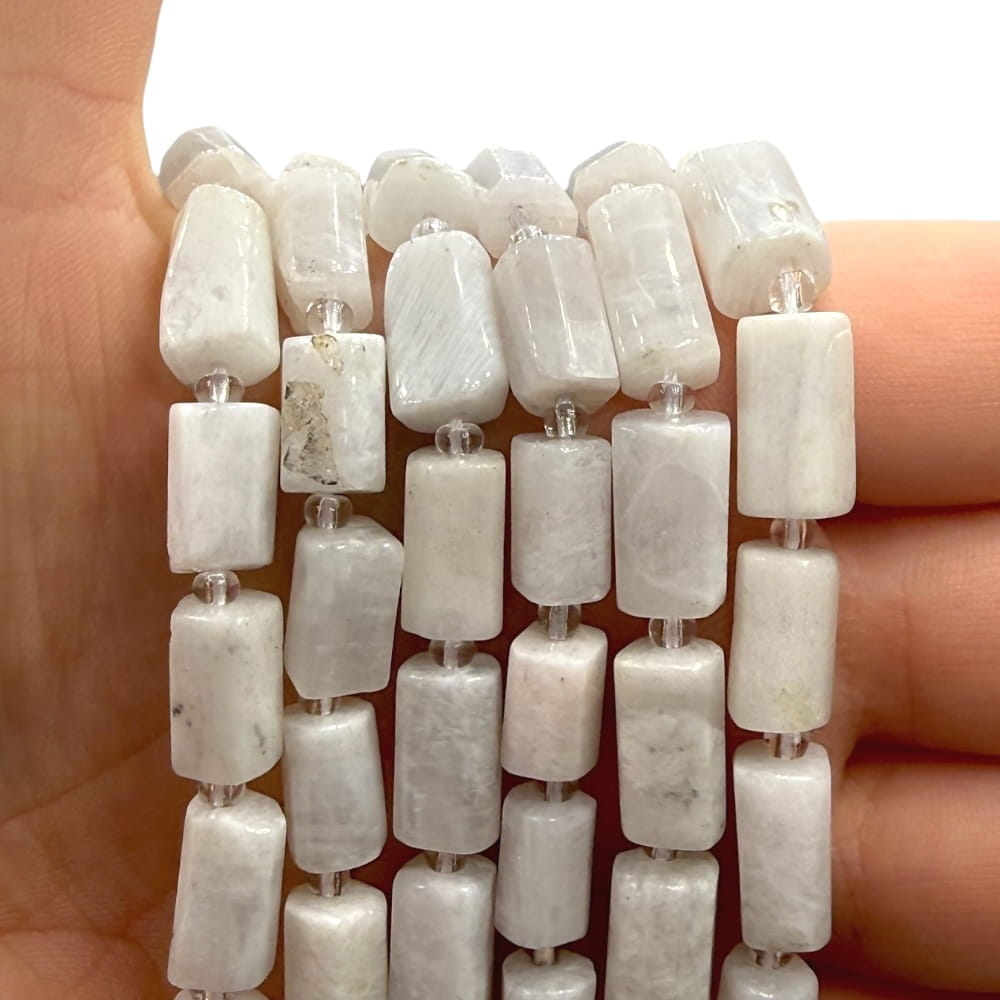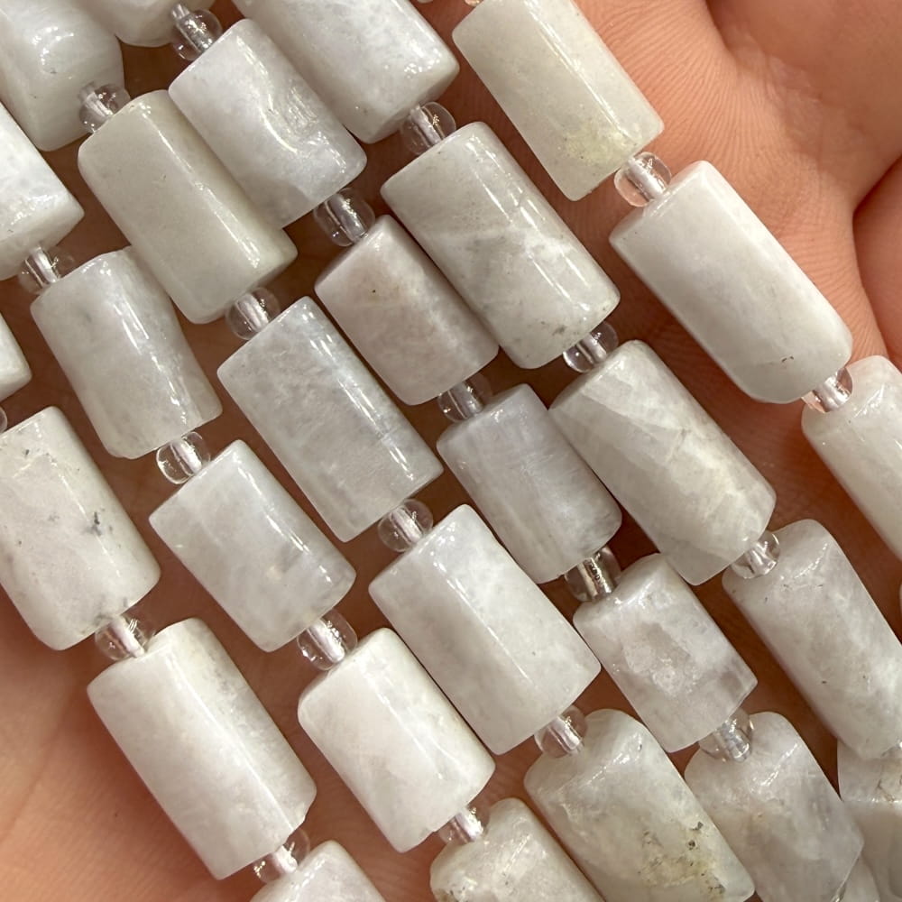 Gładkie walce z kamienia księżycowego, ok. 8×11 mm – subtelny połysk i opalizujące refleksy w naturalnej formie.
